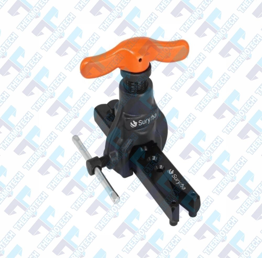 O Flangeador Excêntrico 1/4" a 3/4" é uma ferramenta utilizada para dar forma as extremidades dos tubos, possibilitando vedação completa na união de tubulações, válvulas e registros através do uso de porcas. Conta com limitador de torque, que ao final da operação impede o avanço desnecessário da ferramenta e o aperto excessivo, evitando rachaduras. Conta com uma mesa para fixação do tubo de cobre.